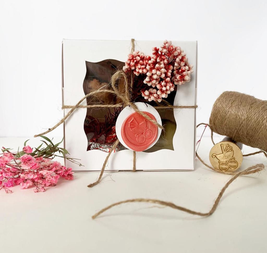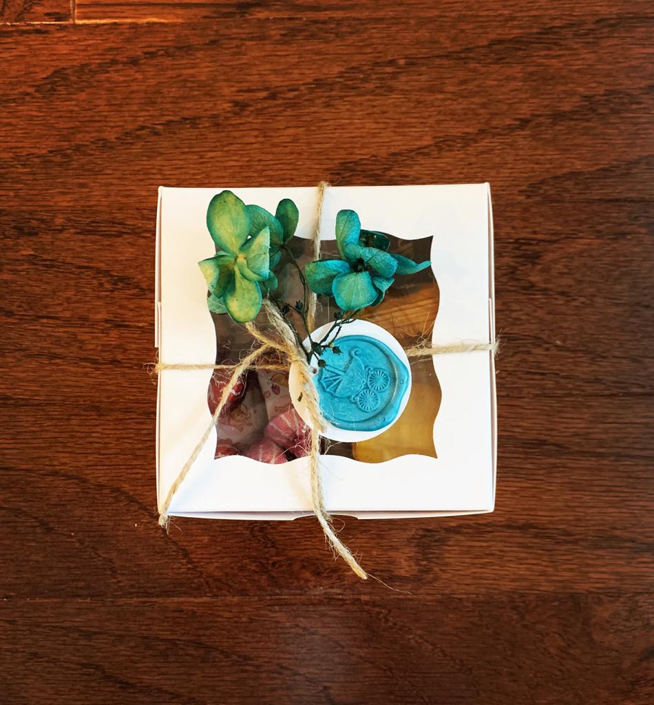 Announce the arrival of your little one with these cute favor boxes. We used carriage themed wax stamps as tags which adds elegance to these beautifully packed boxes.