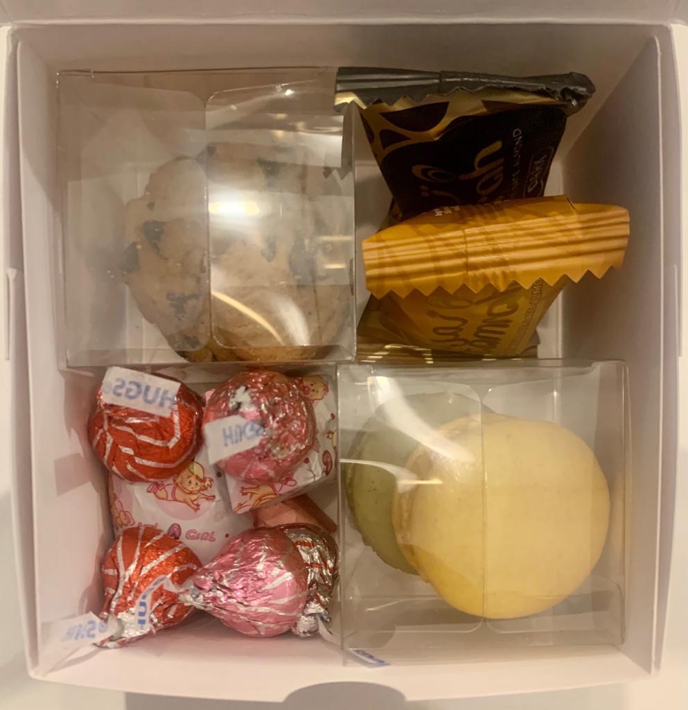 The macarons and chocolate chip cookies were packed in clear cube boxes that we bought from Amazon.